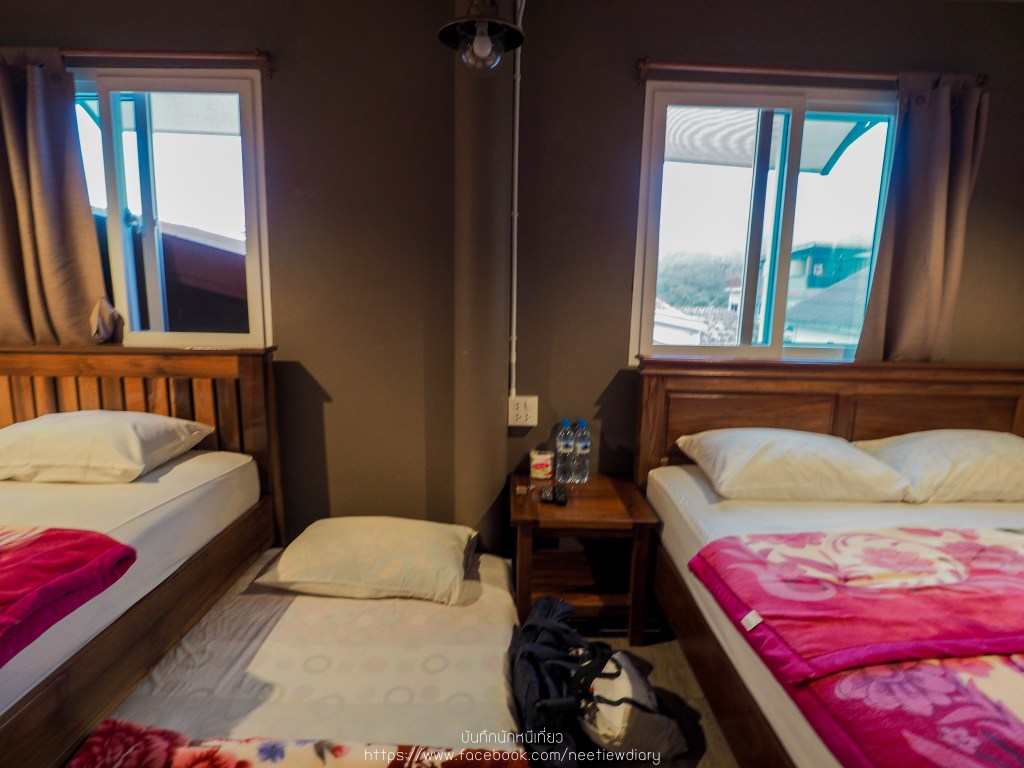 ที่พักในหมู่บ้านอีต่องมีเยอะมากกก สามารถเลือกหาเอาจากในเฟสบุ๊คได้ไม่ยากเลยค่ะ ส่วนเราพักที่บ้านทานตะวัน เป็นห้องแบบ 4 คน มีห้องน้ำในตัว ไม่มีระเบียง เพราะว่าห้องของเราไม่ได้ฝั่งที่เห็นคลอง แต่เป็นถนนจากฝั่งทางเข้าหมู่บ้าน