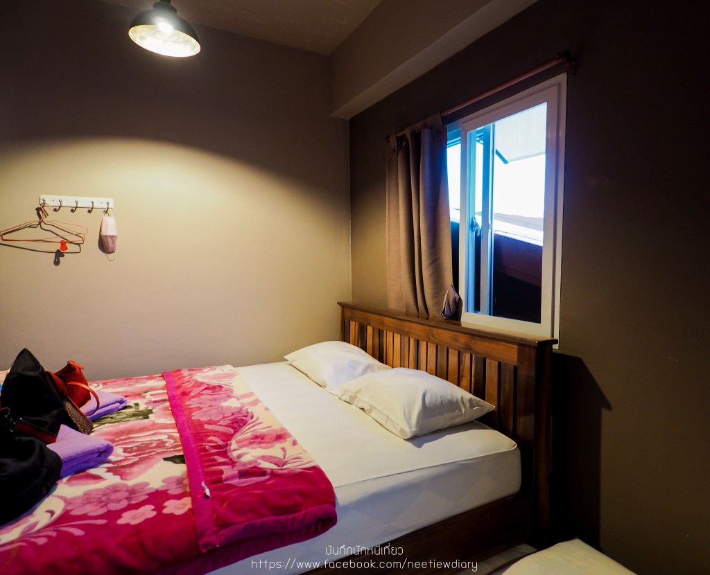 ห้องพักแบบ 4 คน ห้องน้ำในตัว ราคา 1800 บาท + เตียงเสริม 1 เตียง เพิ่มเงิน 300 บาท สรุปว่าห้องนี้เราจ่ายไป 2100 บาท สำหรับ 5 คน มีอาหารเช้ารวมอยู่ด้วย