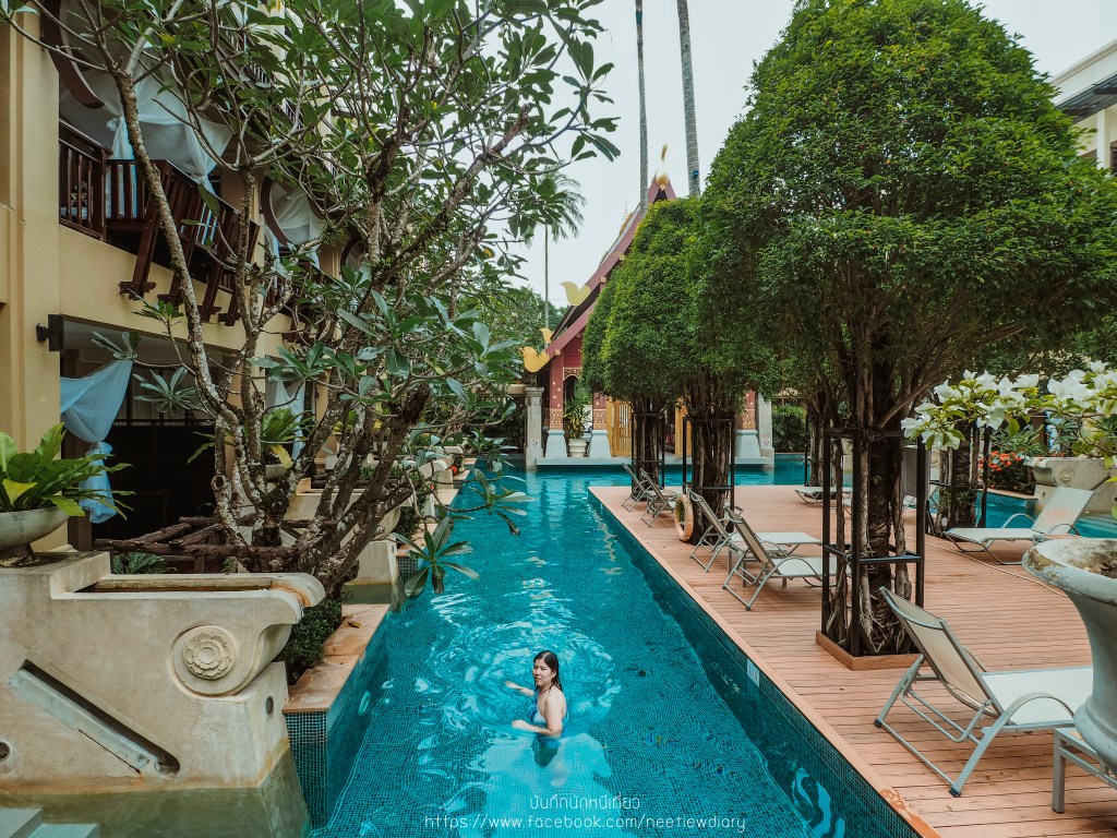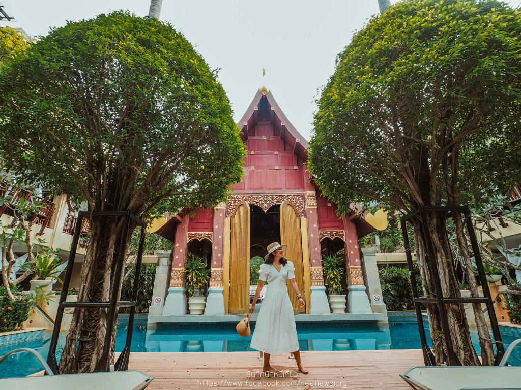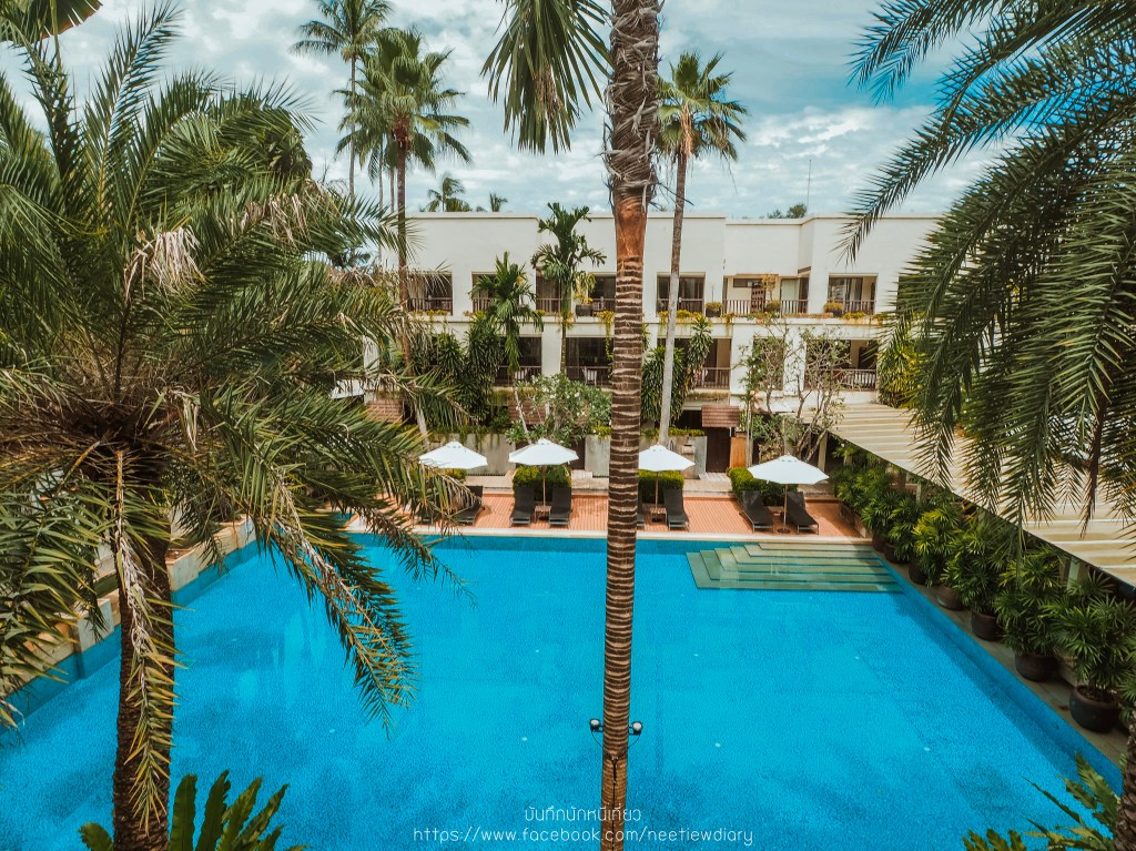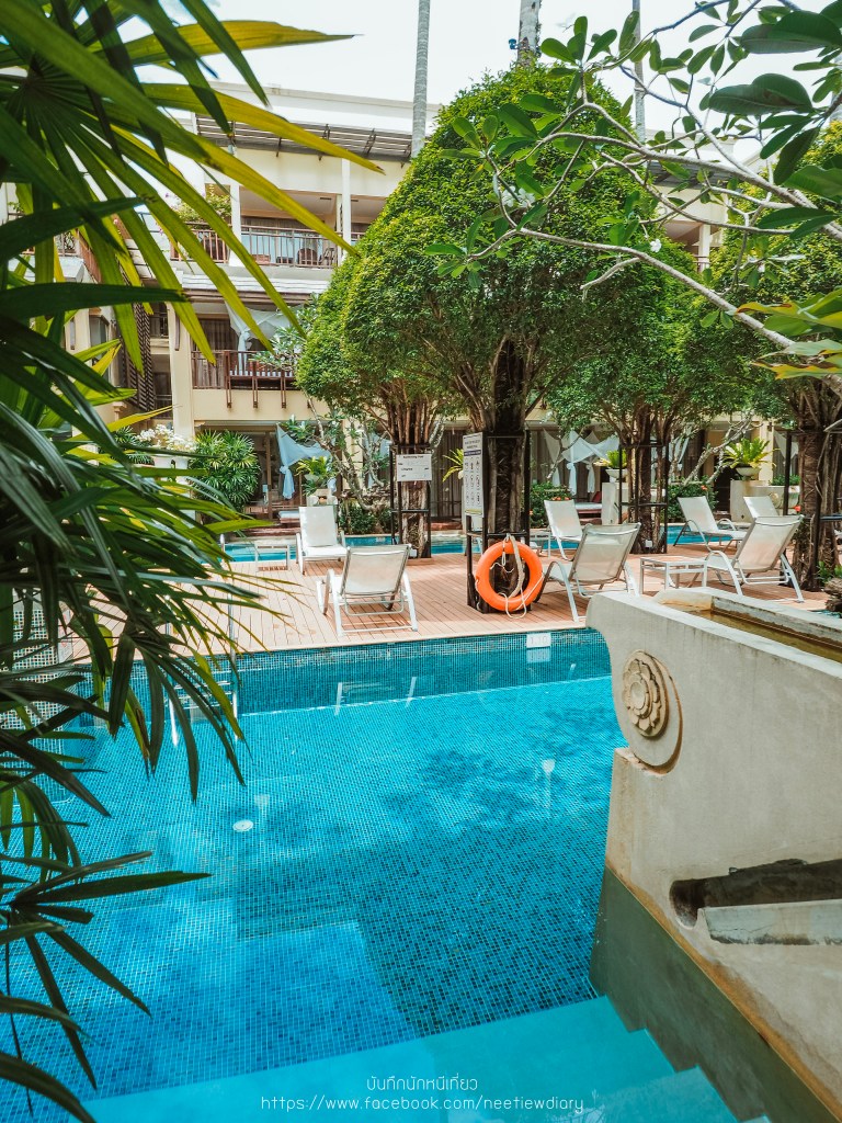 ก่อนจะเริ่มทริปพักผ่อนของเรา เราขอพาไปดูสระส่วนกลางที่ต่อจากห้องเรา