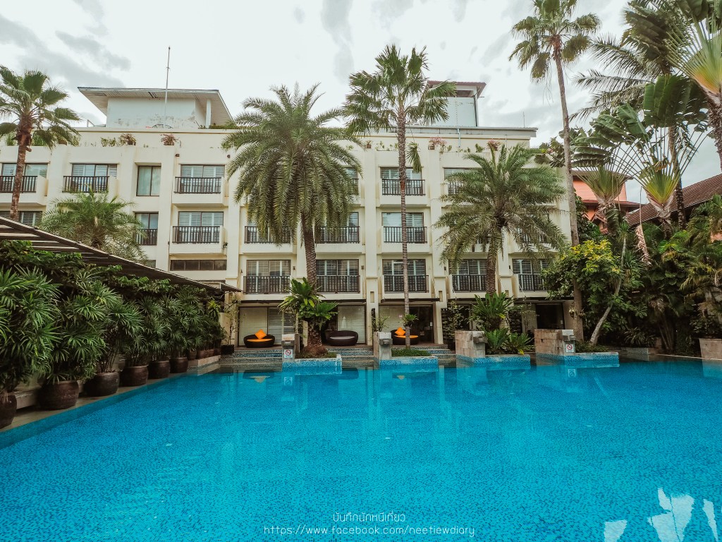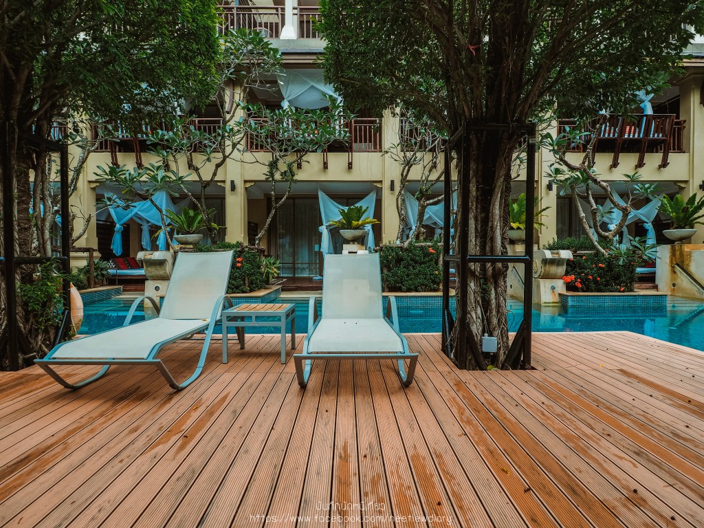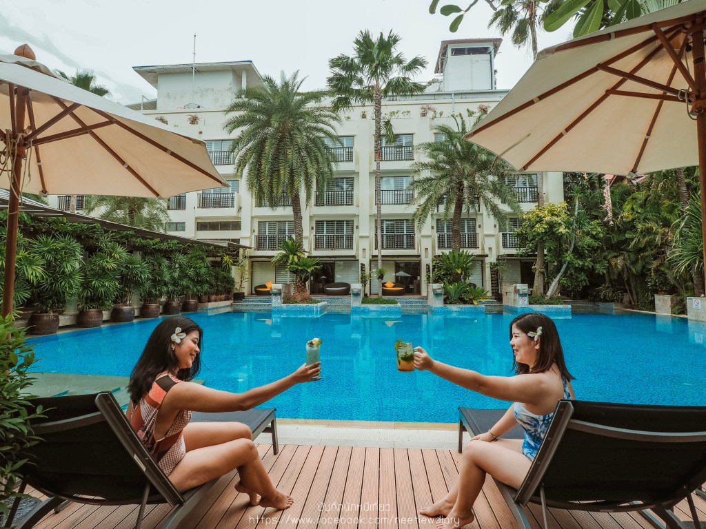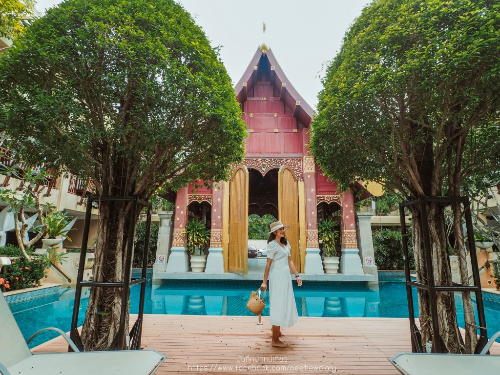 ก่อนจะเริ่มทริปพักผ่อนของเรา เราขอพาไปดูสระส่วนกลางที่ต่อจากห้องเรา