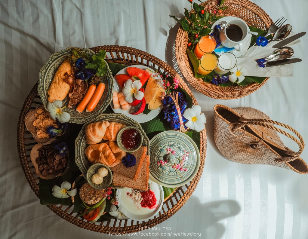 ส่วนใครที่ไม่ได้อยากทานแบบ Floating Breakfast หรือเพราะมีรูปตอน Floating Afternoon Tea แล้ว แต่ก็ไม่อยากไปทานอาหารที่ห้องอาหาร เราแนะนำว่าให้สั่งอาหารเช้ามาแบบขันโตกซึ่งสามารถสั่งมาทานที่ห้องได้เลยค่ะ