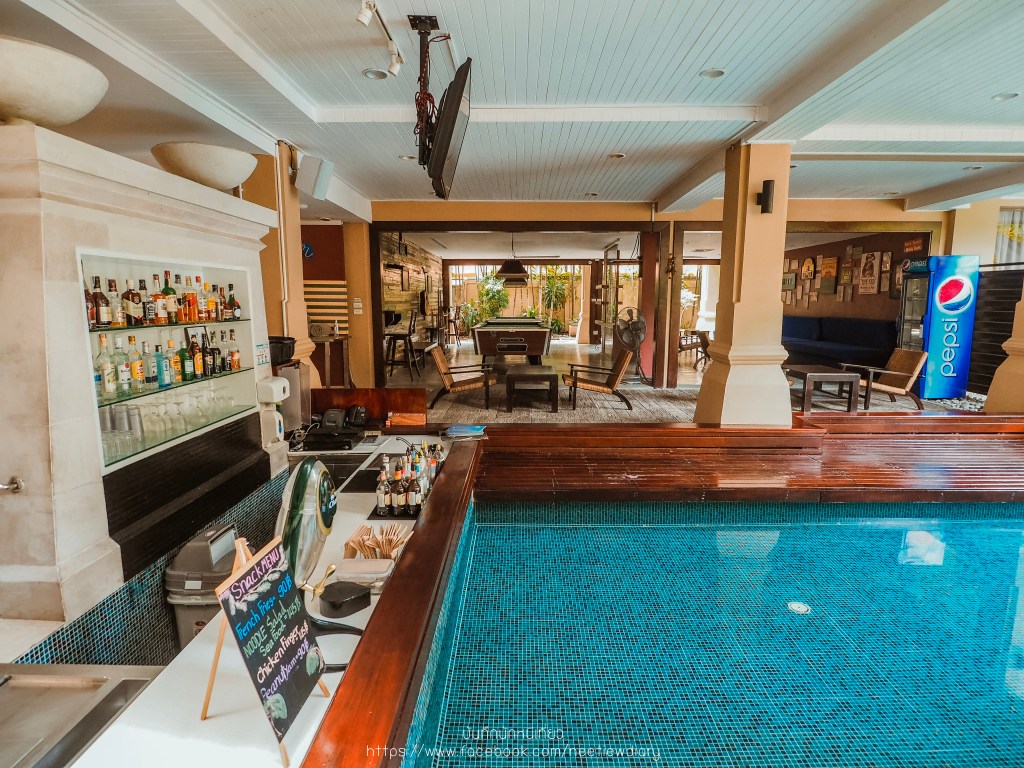 บริเวณสระส่วนกลางที่ติดกับตัวอาคารล็อบบี้จะมี Pool Bar ด้วยนะคะ ใกล้กันยังมีโต๊ะพูลให้เล่นด้วยล่ะ