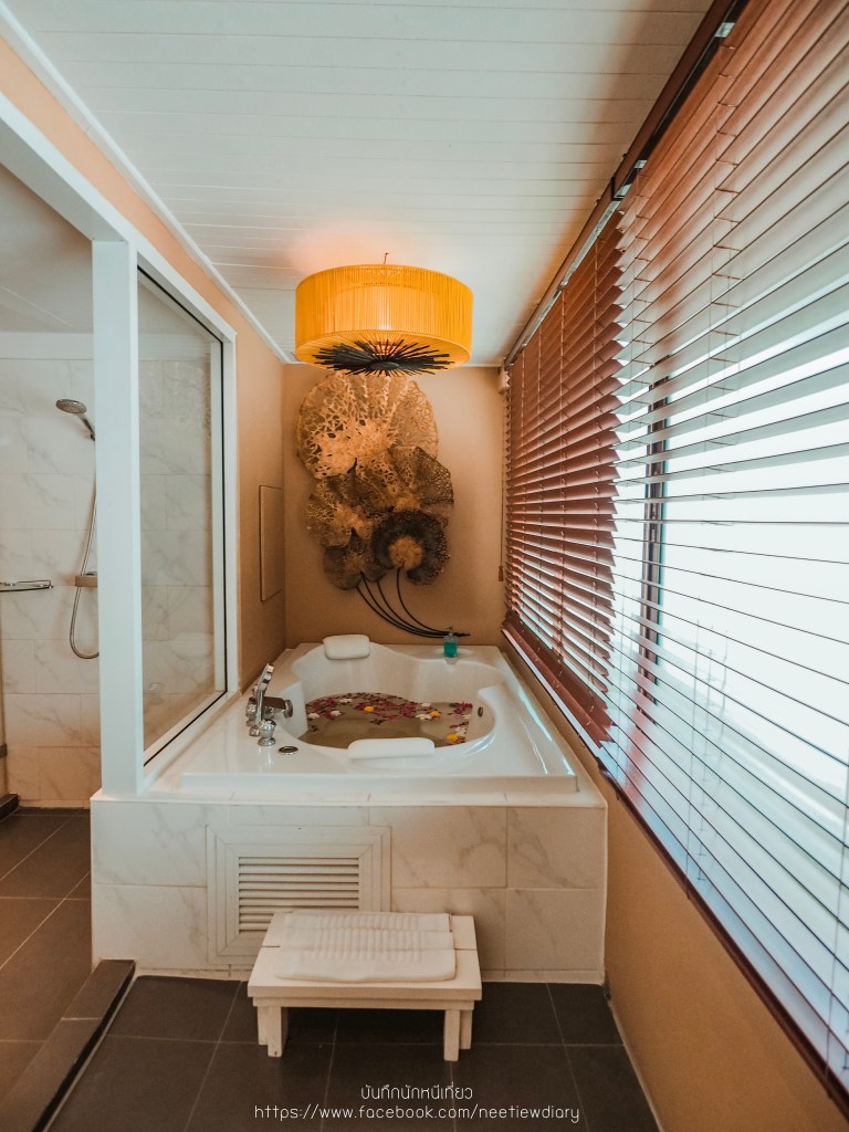 ห้องฮันนีมูน ที่เหมาะสำหรับคู่รัก เพราะกิมมิคของห้องคือระหว่างตัวห้องนอน และห้องน้ำจะไม่มีประตูปิด จะเปลี่ยนมาเป็นม่านกั้นแทนนะ ความดีงามยังไม่หมดเพราะว่าด้วยตัวพื้นที่ใช้สอยที่มีมากถึง 53 ตร.ม. ทำให้มี Bathtub อยู่ที่เฉลียงของห้อง ซึ่งส่วนนี้เราสามารถเปิดประตูออกไปยังสระส่วนกลางได้อีกด้วย