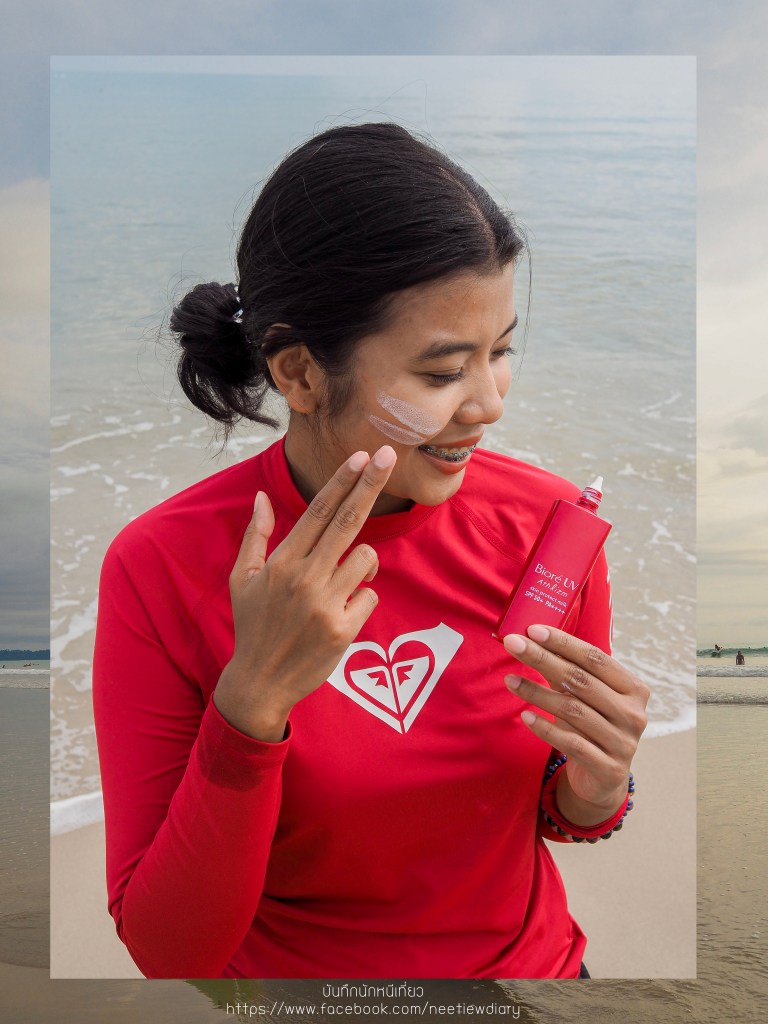 ก่อนจะเริ่มเรียนเซิร์ฟ เราขอทากันแดดก่อนนน แดดที่เขาหลักแรงมากกกกกกกกก มนุษย์ผิวสีน้ำผึ้ง (ไหม้ๆๆ)แบบเรา ก็ต้องทากันแดด หยิบ Biore สีแดงมาทากันก่อน ตัวนี้ที่เราใช้เป็นเนื้อน้ำนมบางเบา เกลี่ยง่าย ไม่เหนอะหนะ มาพร้อมกับการปกป้องขั้นสุดด้วย SPF50+ PA++++