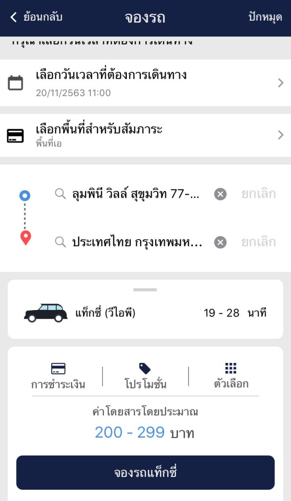 ส่วนเราใช้วิธีจองรถไว้ล่วงหน้าหนึ่งวันค่ะ ก่อนจะถึงวลาจะมีพี่ไดร์เวอร์โทรมายืนยันเวลาและจุดนัดพบก่อน โดยเราปักหมุดจุดรับไว้ที่ ลุมพินี วิลล์ คอนโด แถวอ่อนนุช ปลายทางอยู่ที่ Blue elephant ถนนสาทรใต้ โดยแอปจะบอกเวลาที่ใช้ในการเดินทาง และราคาโดยประมาณเอาไว้