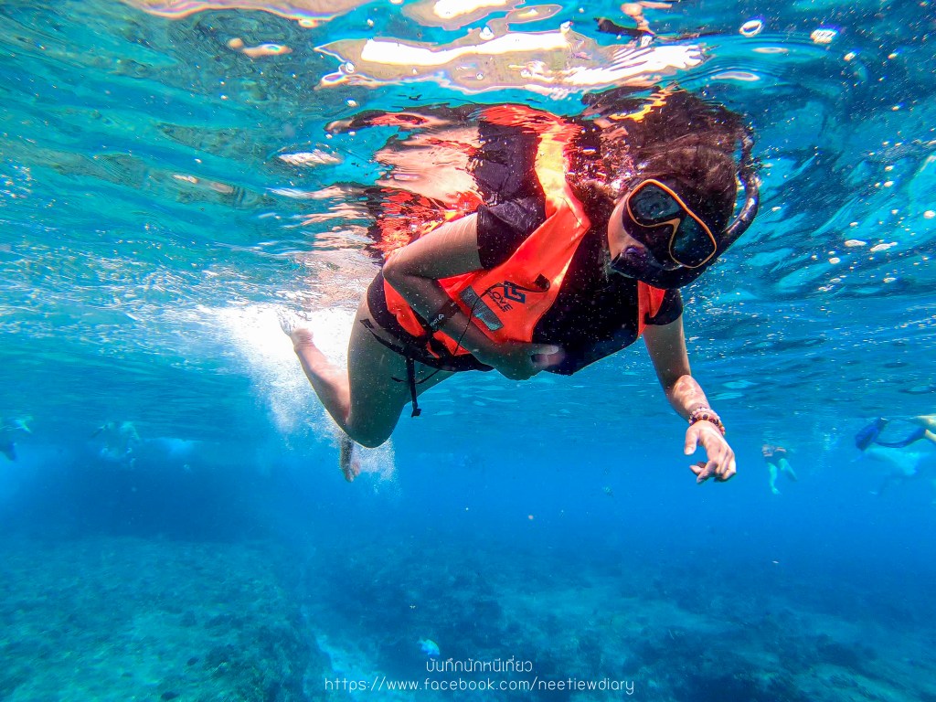 เราว่ายน้ำไม่ได้แข็งมาก และห่างหายจากทะเลไปนานพอสมควรเลยขอใส่ชูชีพนะคะ เพราะกลัวจะเป็นภาระให้พี่ๆเรือเวลาที่เกิดเป็นตะคริวขึ้นมา (เขิลลลลเลย)