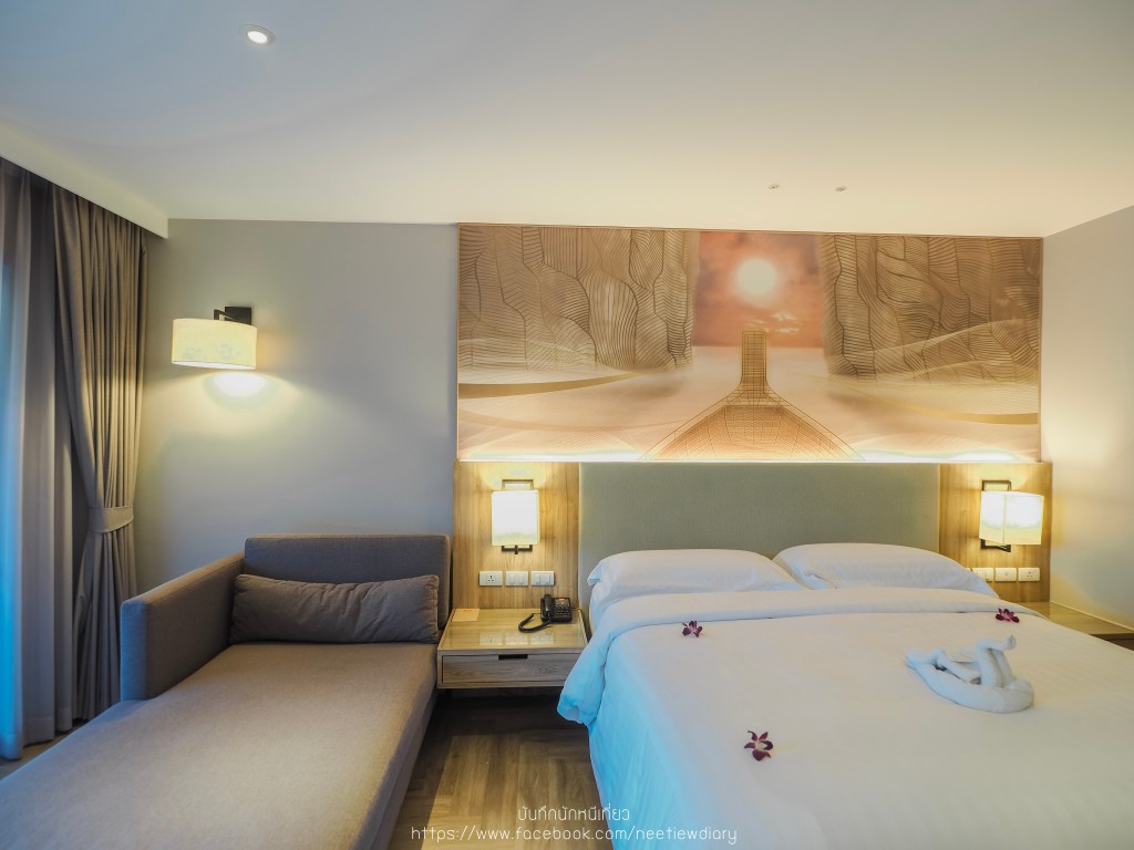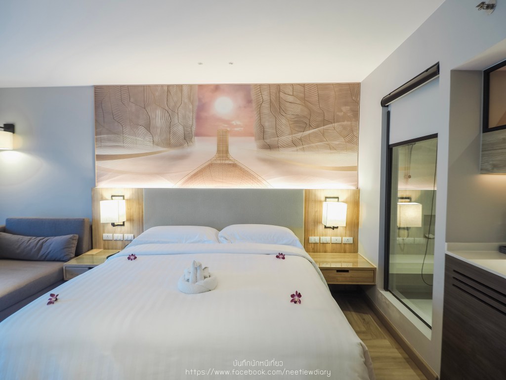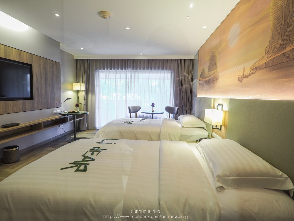 มาดูภายในห้องกันค่ะ ด้วยขนาด 36 – 40 ตารางเมตร ภายในห้องประกอบไปด้วยสิ่งอำนวยความสะดวกแบบครบครัน คืนนี้เราเลือกนอนแบบเตียงคู่สองเตียง ซึ่งก็ไม่ได้ทำให้ห้องของเราดูแคบลงไปเลย