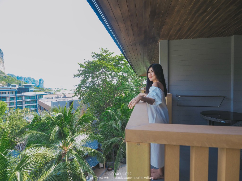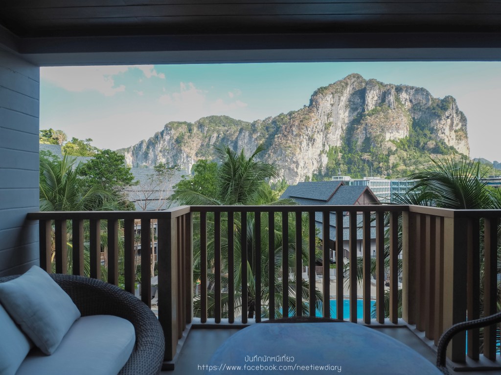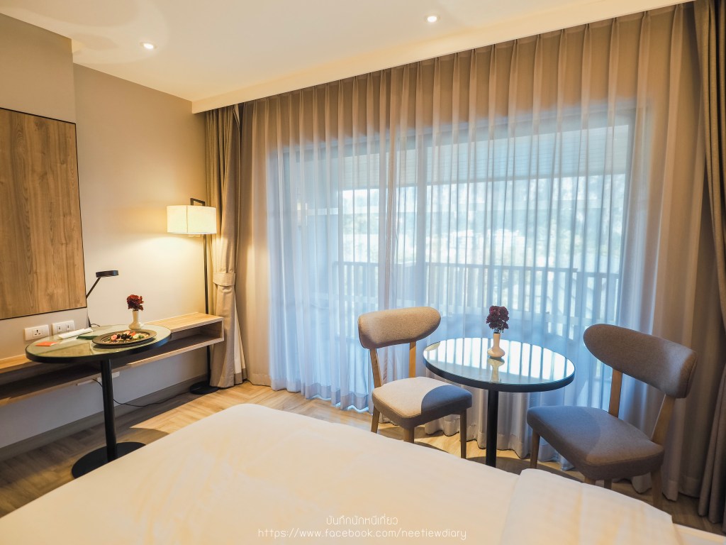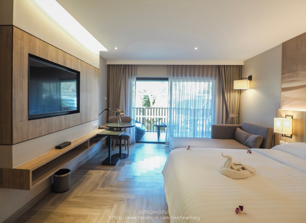 ทริปนี้เราเลือกพักห้อง D’Luxe Room with Sea View เป็นห้องที่มีขนาดใหญ่พอสมควรเมื่อเทียบกับสองคน มีระเบียงกว้างที่มองเห็นวิวภายในโรงแรม สระว่ายน้ำ ภูเขา และ ทะเล