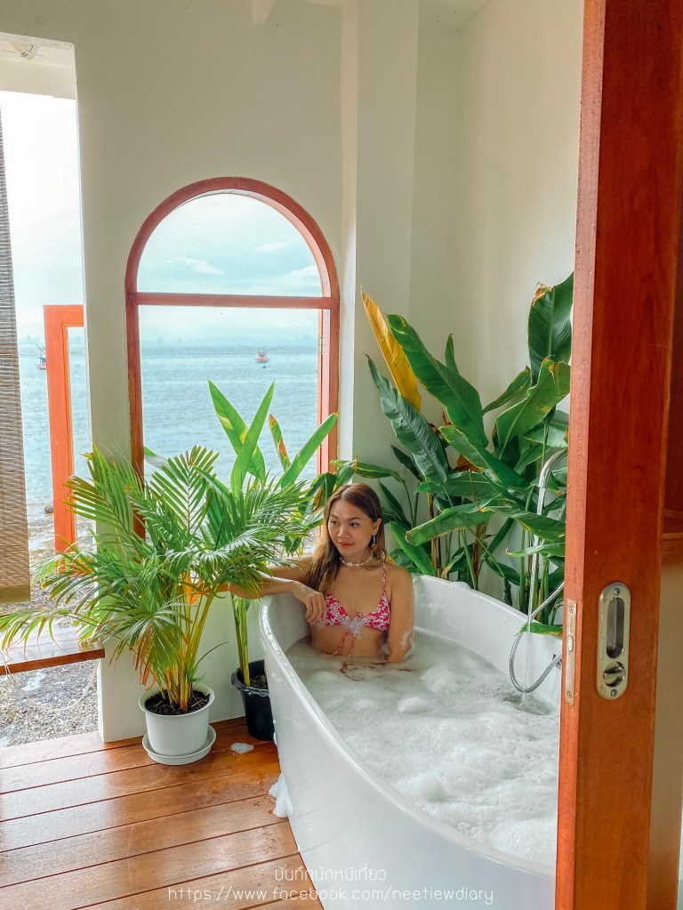 อีกหนึ่งจุดเด่นของที่นี่คือ ทุกห้องจะมี bath tub ซึ่งมุมที่วางก็จะแตกต่างกันไปตามตำแหน่งของห้อง แต่ห้องเรา seaview 2 มุมนี้คือสวยมาก โดยเฉพาะตอนที่แสงเช้าสาดเข้ามา
