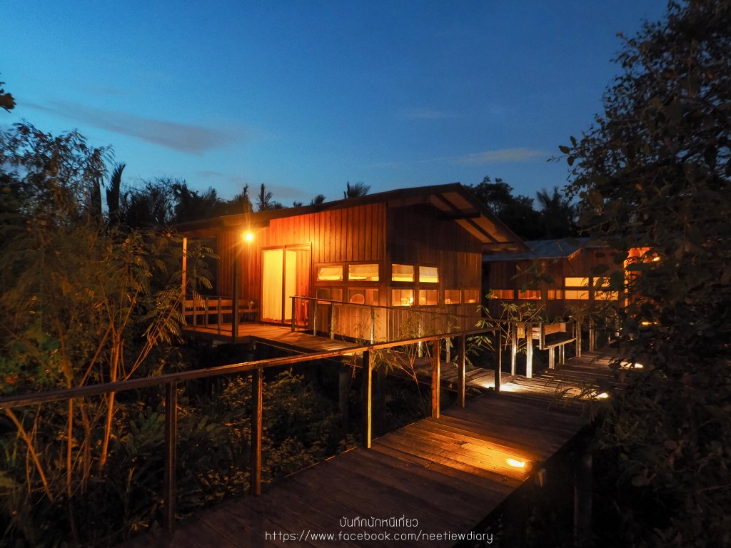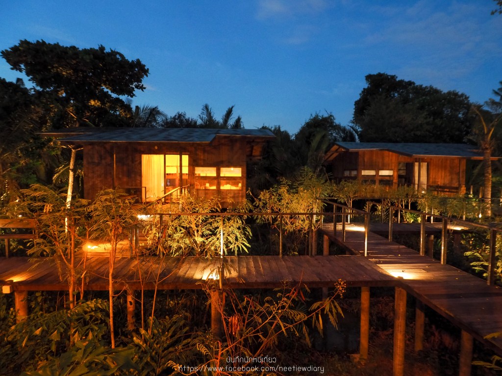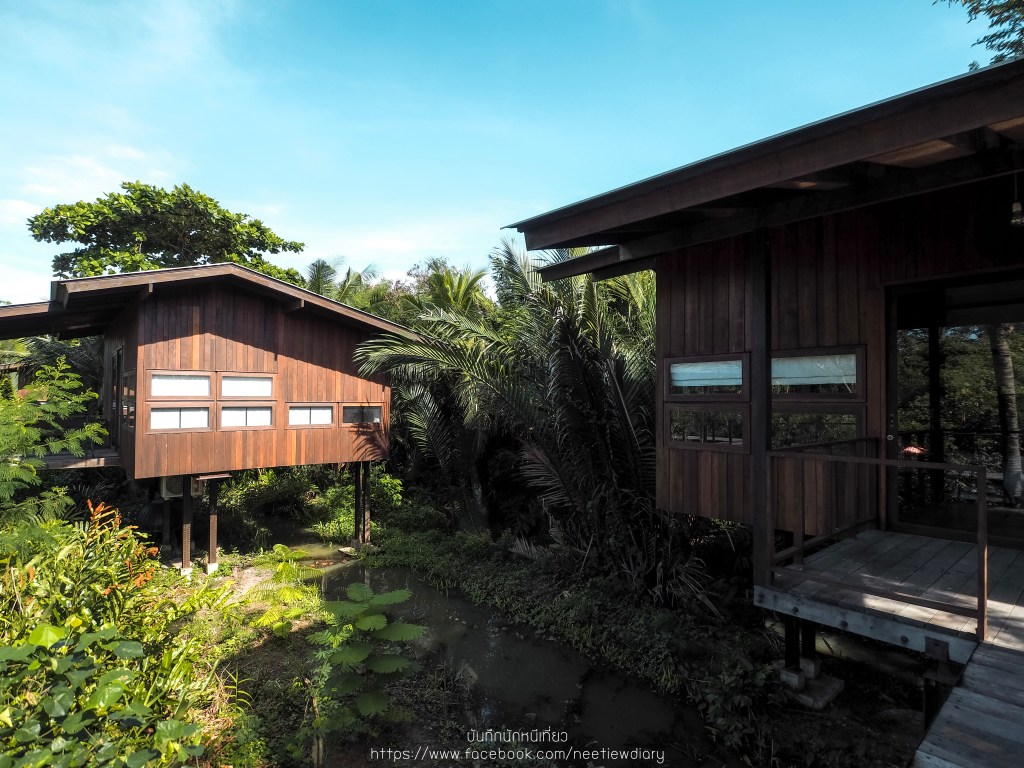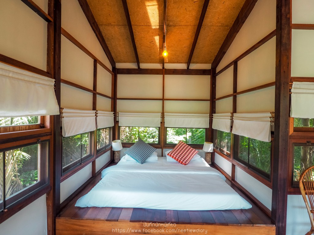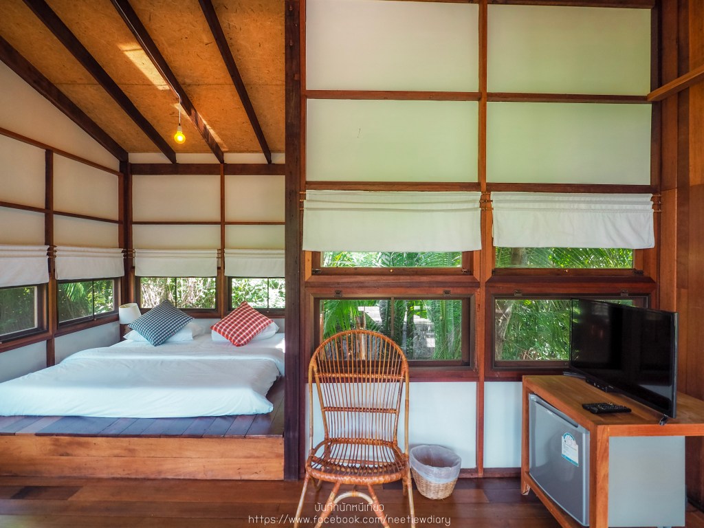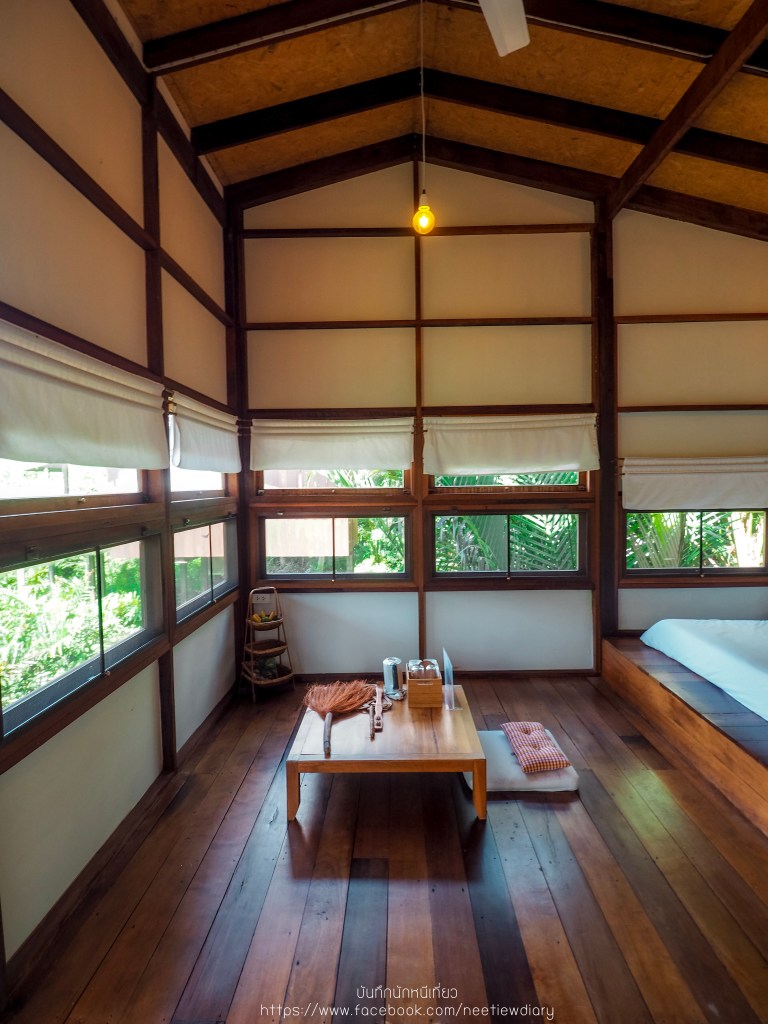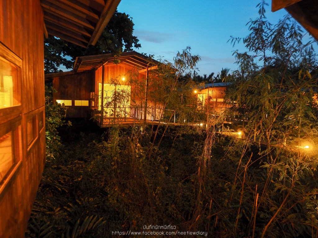 บรรยากาศภายในที่พัก มีความอบอุ่นเป็นกันเองมากๆ บ้านแต่ละหลังจะเชื่อมกันด้วยสะพานไม้ มีต้นกระถิ่นที่คอยกั้นแบ่งความเป็นส่วนตัวของบ้านแต่ละหลัง
