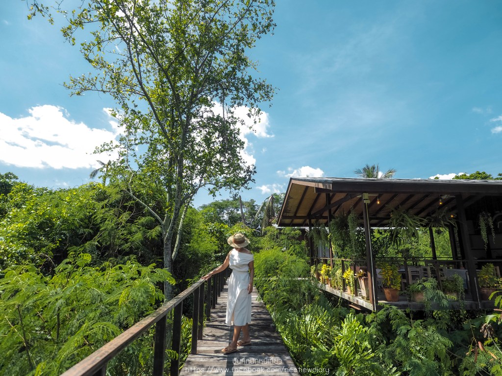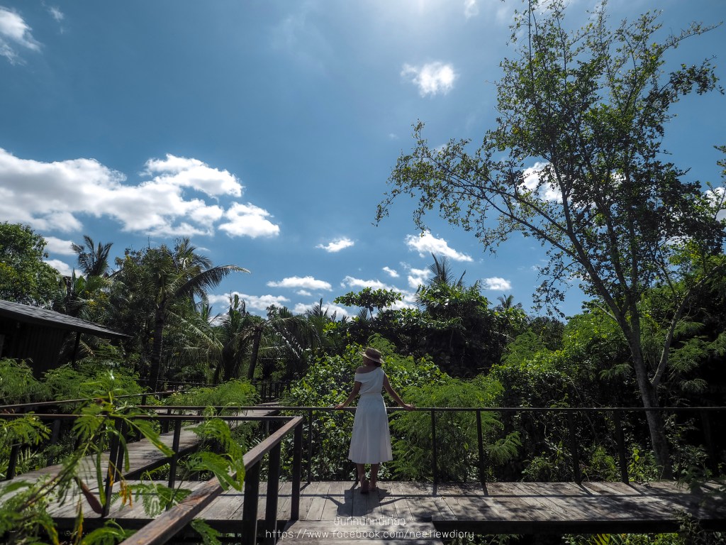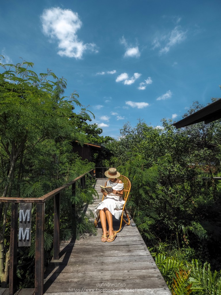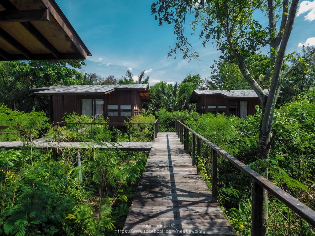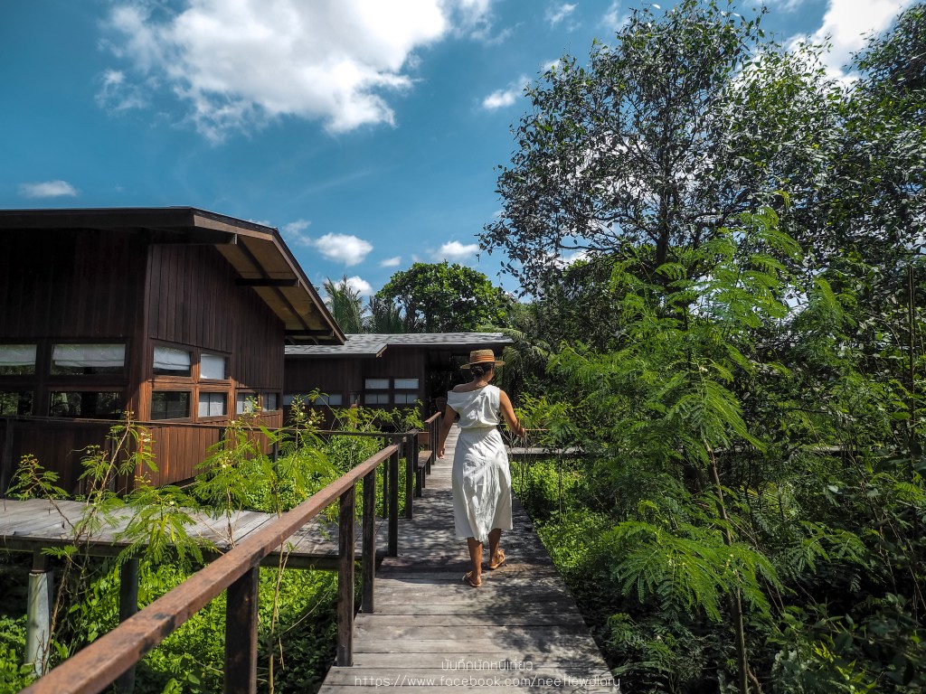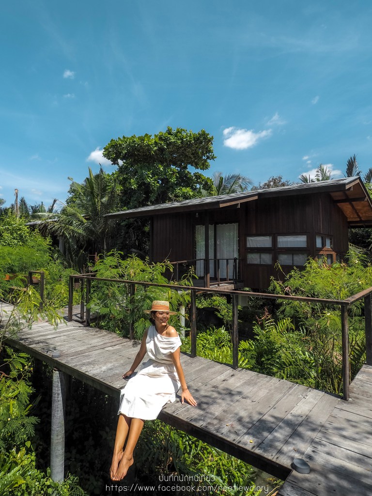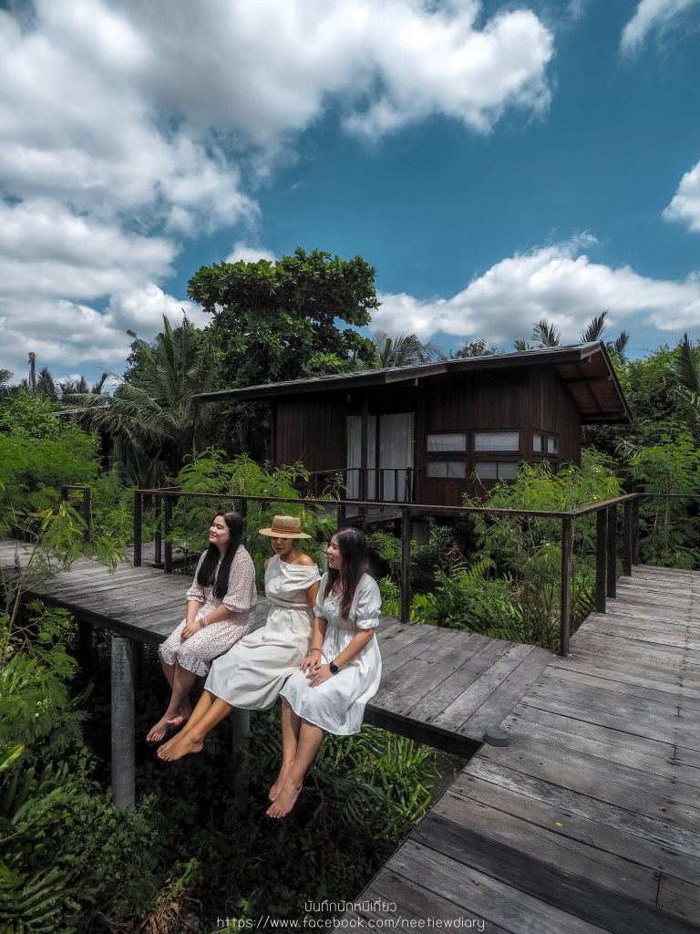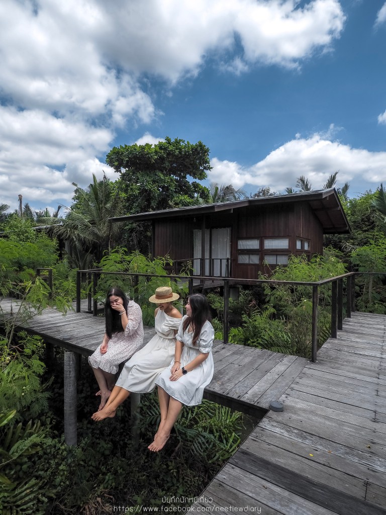 บรรยากาศภายในที่พัก มีความอบอุ่นเป็นกันเองมากๆ บ้านแต่ละหลังจะเชื่อมกันด้วยสะพานไม้ มีต้นกระถิ่นที่คอยกั้นแบ่งความเป็นส่วนตัวของบ้านแต่ละหลัง