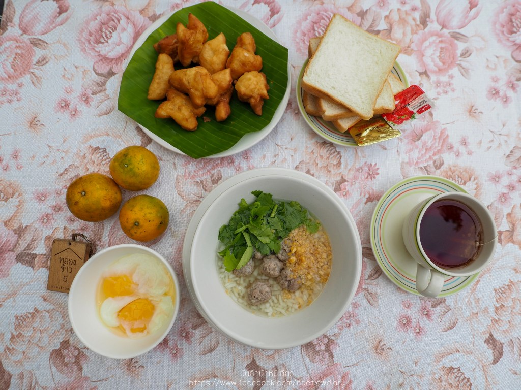 อิ่มกับวิวแล้ว ก็มาอิ่มกับอาหารเช้ากันต่อ อาหารเช้าที่นี่จะเป็นชุดข้าวต้ม ขนมปังปิ้ง กาแฟ และ ผลไม้