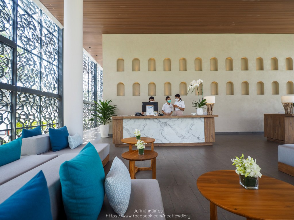เมื่อมาถึงแล้วก็มาเช็คอินกันก่อนค่ะ ใช้เวลาไม่นานมากนัก พนักงานที่นี่น่ารัก บริการดีมาก รอไม่นานก็ได้กุญแจห้องมาแล้วค่ะ และด้วยสถานการณ์ในช่วงนี้ทางรีสอร์ทจะไม่เสิร์ฟ welcome drink ที่ล็อบบี้นะคะ แต่จะใส่ไว้ในตู้เย็นภายในห้องเราเรียบร้อยแล้ว