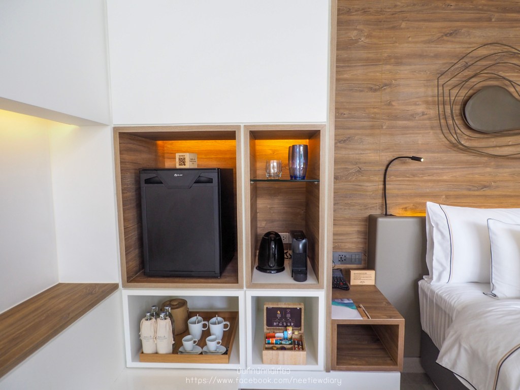 ก่อนจะพาไปสำรวจห้อง เราขอเปิดตู้เย็นหยิบ welcome drink มาจัดการก่อน เพราะว่าแดดที่ภูเก็ตแรงขนาดนี้ เครื่องดื่มสดชื่นๆ ช่วยเยียวยาได้เยอะเลยค่ะ