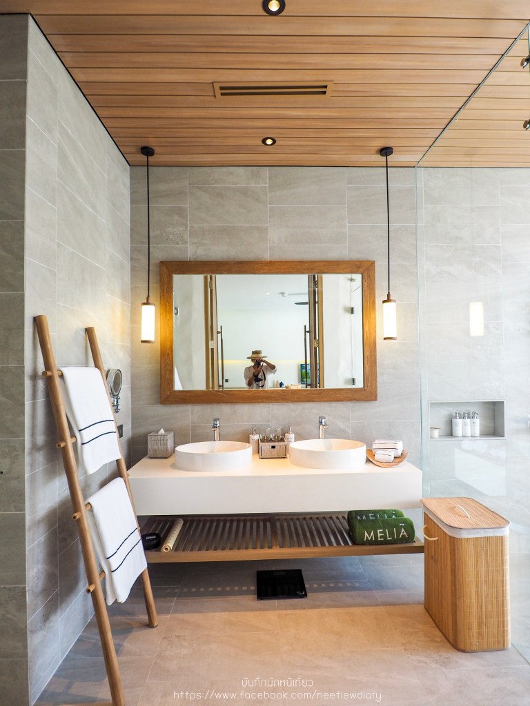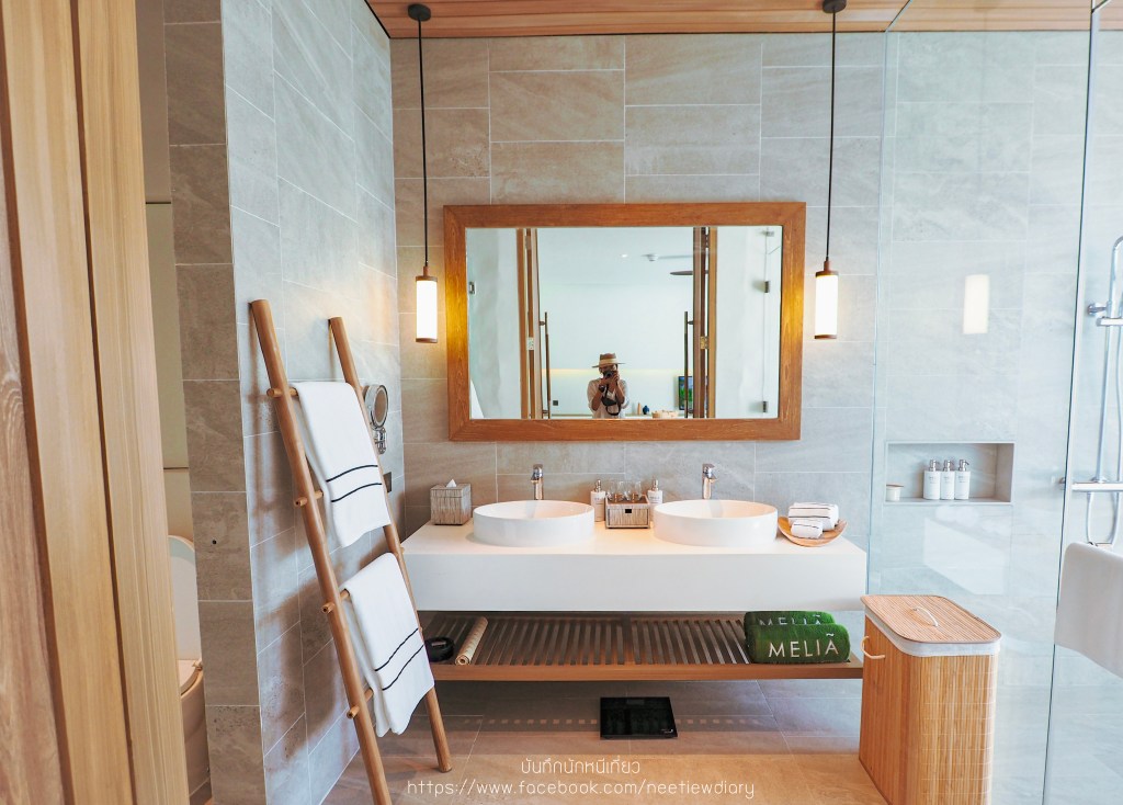 ถัดมาคือโซนห้องน้ำ ซึ่งโซนนี้เป็นโซนที่เราชอบมาก เพราะนอกจากกระจกเงาที่กว้างมาก อ่างล้างหน้าแบบ his & her และอุปกรณ์ต่างๆที่ครบครันก็เห็นจะเป็นการออกแบบที่เรารู้สึกว่ามีความน้อยแต่มาก มีความใส่ใจผู้ใช้งานจริงอยู่ในทุกการออกแบบ