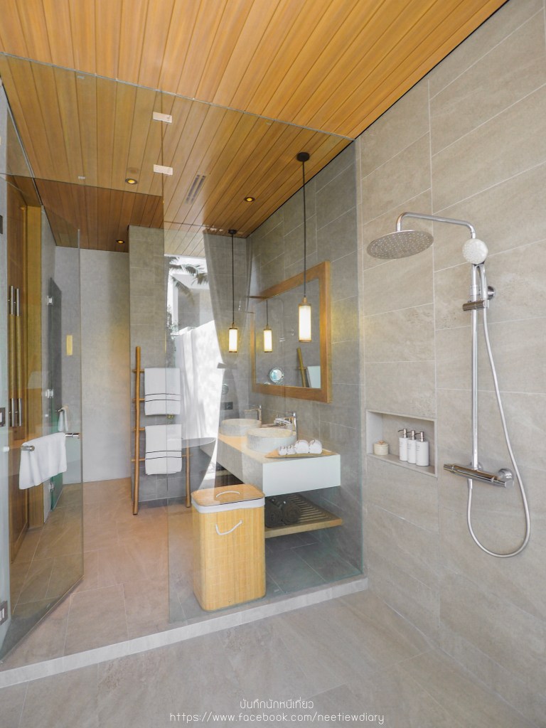โซนห้องน้ำที่ออกแบบมาเป็น semi outdoor ทำให้เราสามารถใช้ได้จากทั้งฝั่งในห้องนอน และจากสระว่ายน้ำ ทำให้เวลาที่เราเล่นน้ำในสระ หรือแช่น้ำในอ่าง แล้วจะขึ้นมาล้างตัวและอาบน้ำต่อ เราไม่จำเป็นต้องเดินผ่านห้องนอน ทำให้ห้องไม่เปียก ส่วนนี้เราว่าดีมากเลยค่ะ