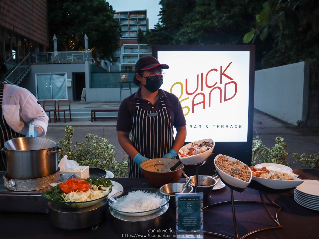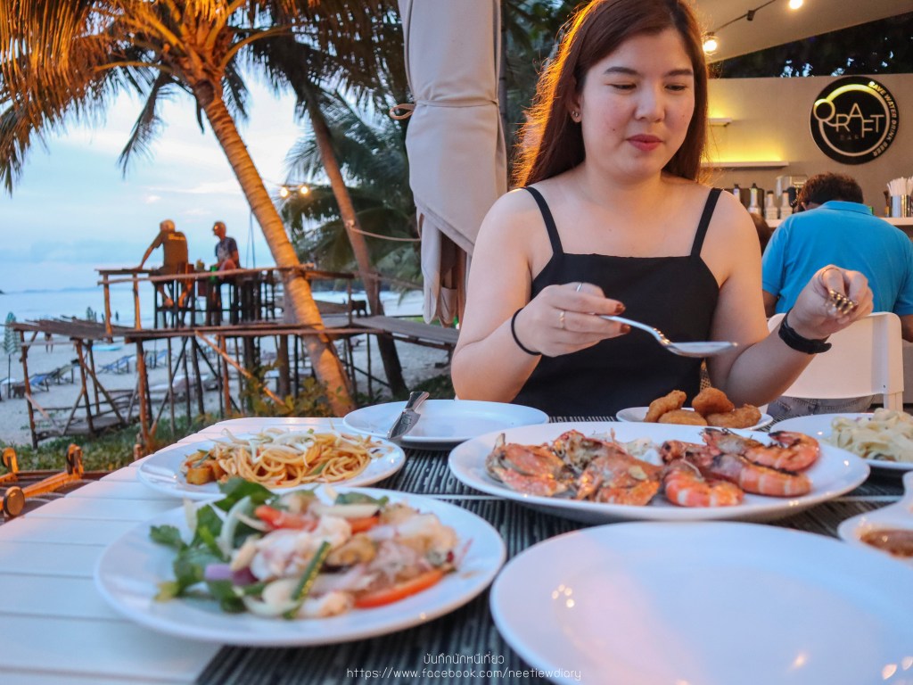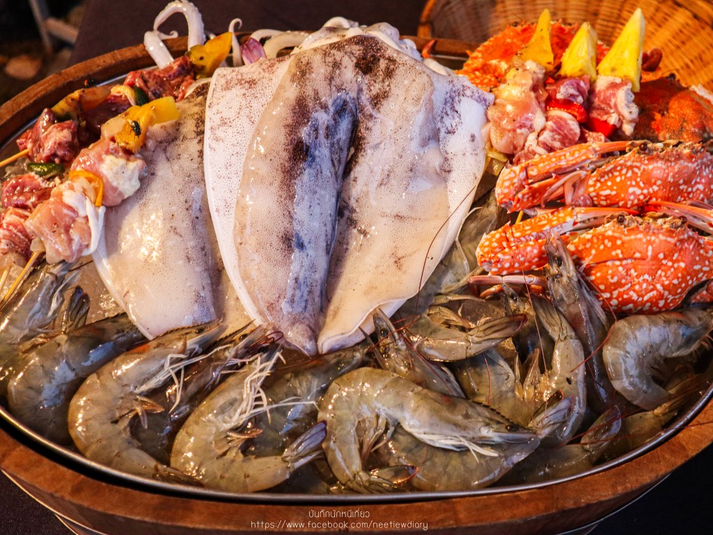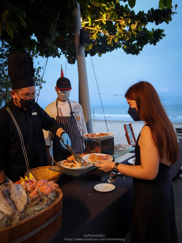 วิ่งเล่นเป็นนางเอก MV กับทะเลในวันหม่นหมองจนเหนื่อย และเริ่มหิว วันที่เราพักเป็นวันเสาร์จะมีบุพเฟ่ต์อาหารทะเลด้วยค่ะ (จำราคาไม่ได้) โดยห้องอาหารจะอยู่บริเวณหาดเลยค่ะ บรรยากาศดีทีเดียวนะ