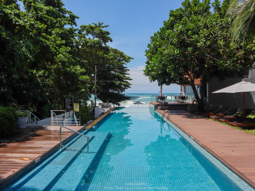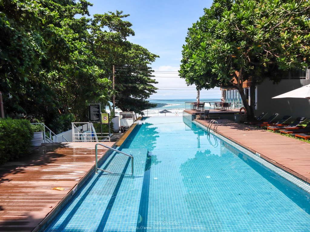 ทานข้าวเสร็จแล้วก็ไปเดินย่อยกันหน่อย จากห้องอาหารไปยังหาดเราจะเดินผ่านสระส่วนกลาง โดยสระของที่นี่จะเป็นรูปทรงสี่เหลี่ยมผืนผ้า ยาวพอให้เราได้ว่ายน้ำไปกลับเหนื่อยเลยค่ะ