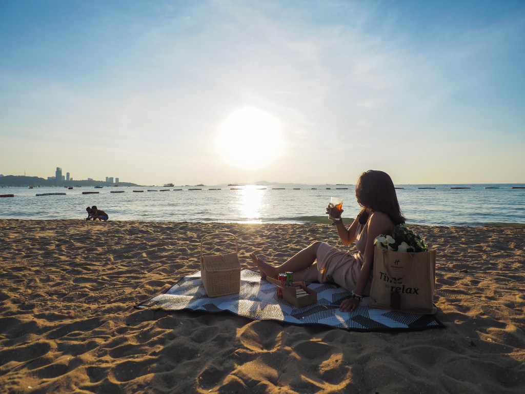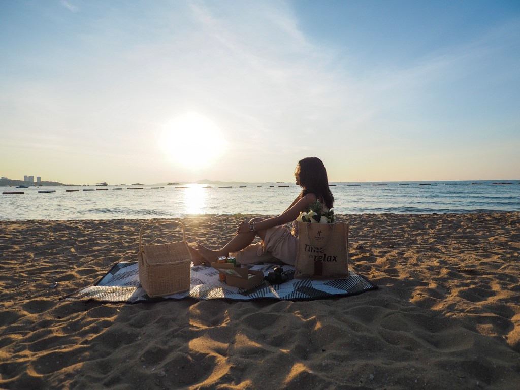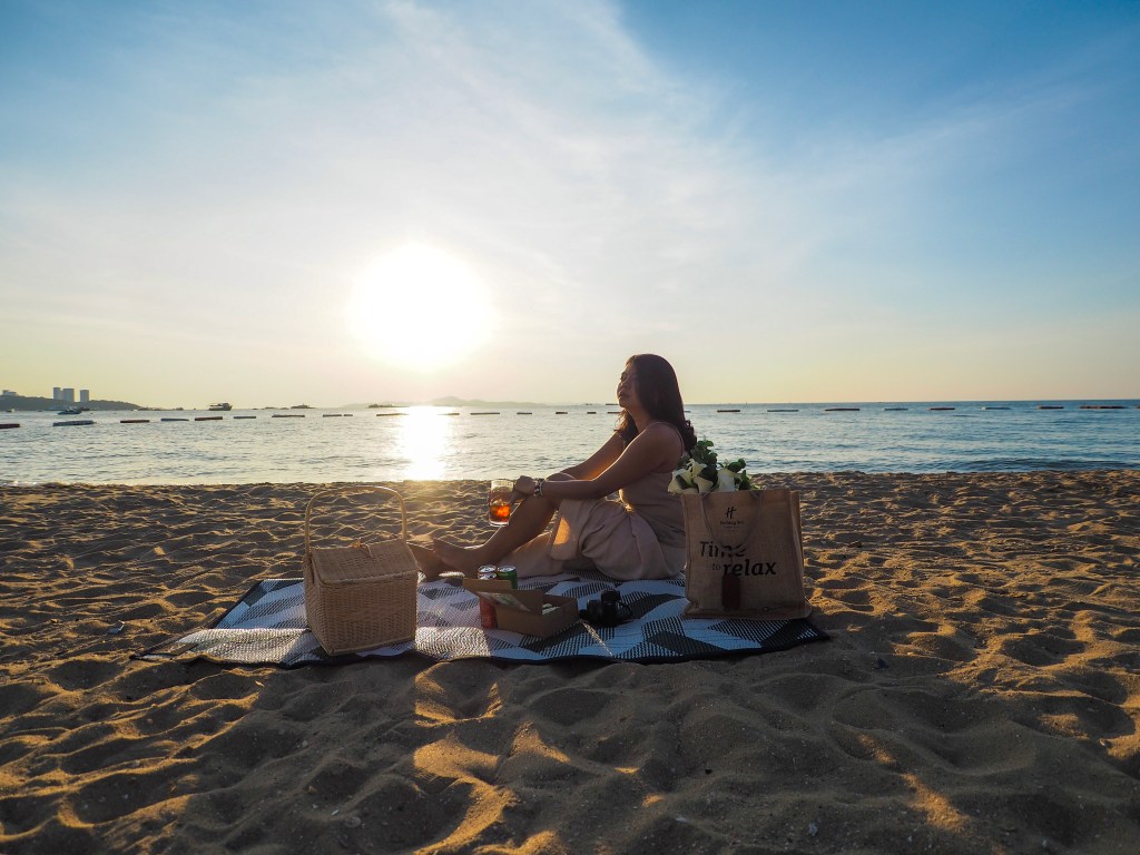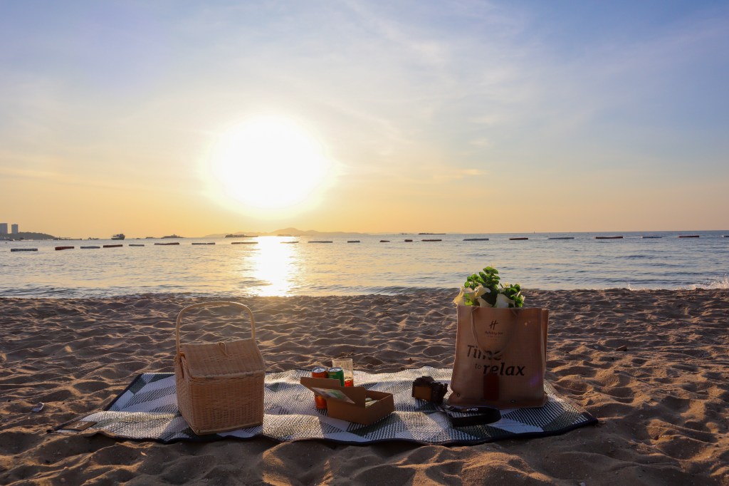 หลังจากเพลิดเพลินกับวิวสวยๆภายในห้องพักของเราแล้ว วันนี้อากาศที่พัทยาดีมากเลยค่ะ ฟ้าสวยมากจริงๆ เราเลยขอให้ทางโรแงรมช่วยเตรียมเซ็ทปิกนิกให้หน่อยค่ะ ใครที่มาพักที่นี่อยากจะไปนั่งเล่นชิลๆที่ริมทะเล ก็สามารถให้ทางโรงแรมจัดเซ็ทปิกนิกแบบเราได้นะคะ โดยภายในเซ็ทจะมีชุดอาหารทานเล่น เครื่องดื่ม พร้อมกับเสื่อ และดอกไม้สำหรับจัดเซ็ทสวยๆมาให้พร้อมเลยค่ะ