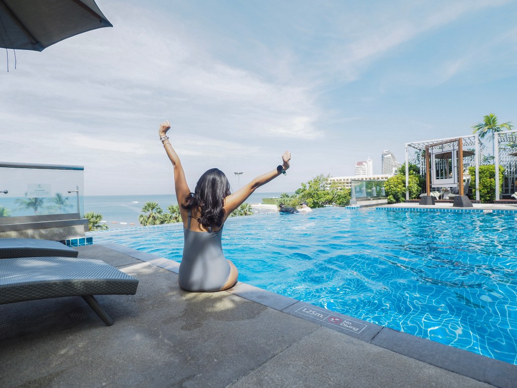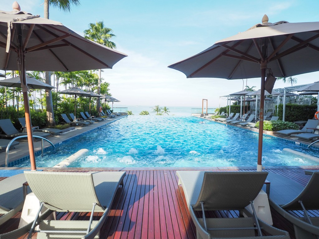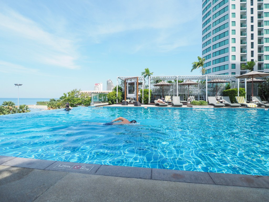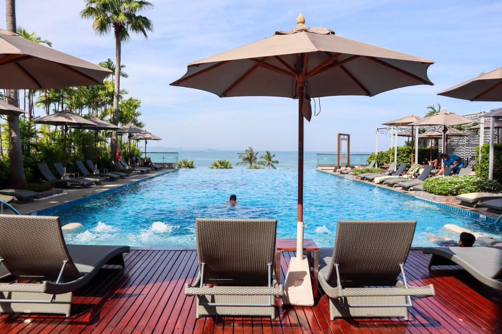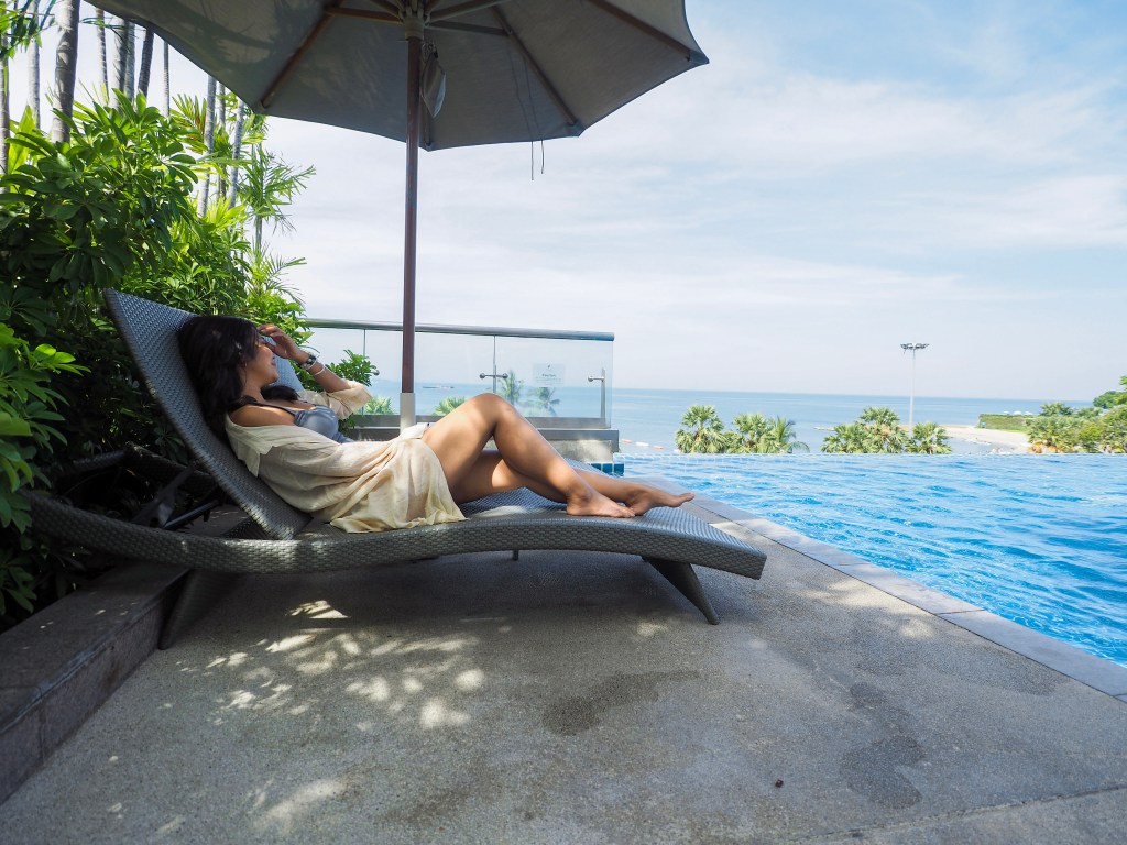 อิ่มจากอาหารเช้าแล้ว เราไปนั่งเล่นชิลๆที่สระว่ายน้ำกันค่ะ สระว่ายน้ำที่นี่สวยมากเลยค่ะ วิวดีมาก เราจะมองเห็นทะเล ในวันที่อากาศดีๆ มุมสระว่ายน้ำถือว่าดีมากเลยนะ