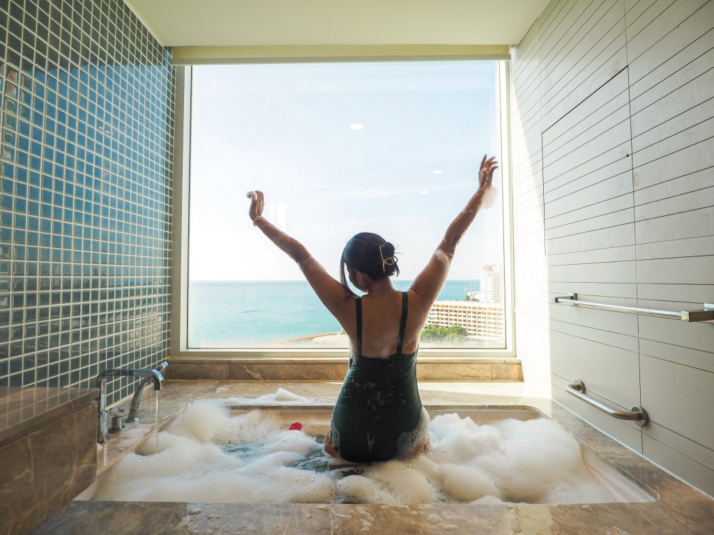 และโซนสุดท้ายที่เป็นจุดขายของห้องนี้คือ ห้องน้ำ เพราะห้องน้ำที่นี่วิวสวยมากกกกกกกก พื้นที่ภายในห้องน้ำกว้างมาก กระจกบานใหญ่พร้อมอ่างล้างหน้า 2 อ่าง ภายในห้องน้ำแยกส่วนเปียกและส่วนแห้งออกจากกันชัดเจน และมุมที่ปังที่สุดคือวิวอ่างสำหรับแช่ตัว มุมนี้เริ่ดมากกก