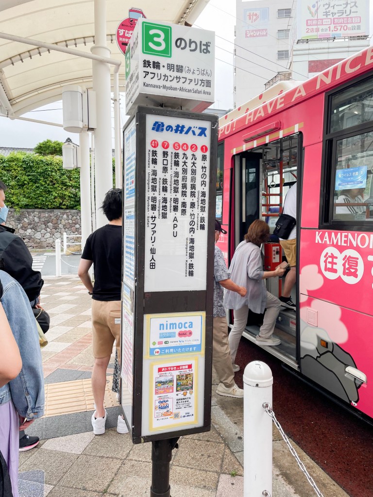 ให้เราไปรอขึ้นที่ป้ายหมายเลข 3 หน้าสถานีเบปปุ จากนั้นก็ให้ไปลงที่ป้ายป้าย Umi Jigoku Mae ซึ่งจอที่รถจะบอกว่าเรากำลังจะไปป้ายไหน และ ป้ายนี้ไม่มีหลงแน่นอนเพราะนักท่องเที่ยวส่วนใหญ่จะลงป้ายนี้กัน