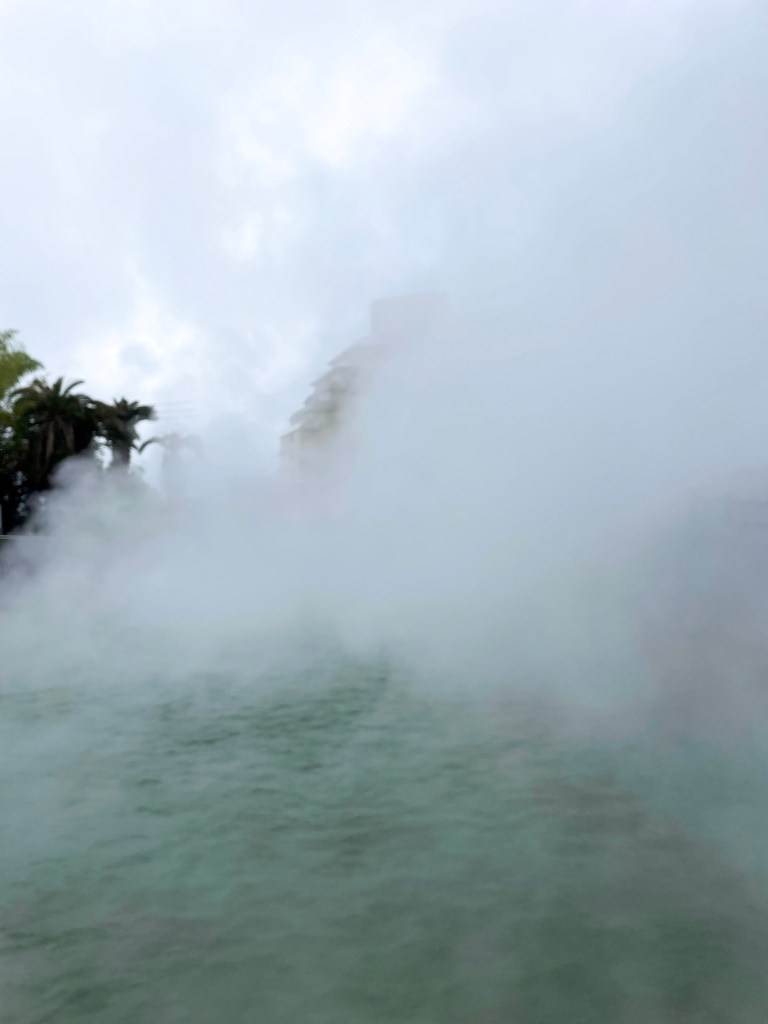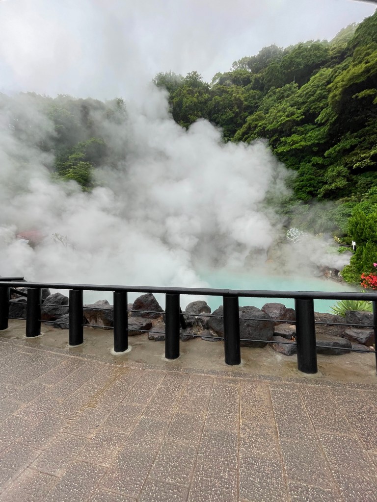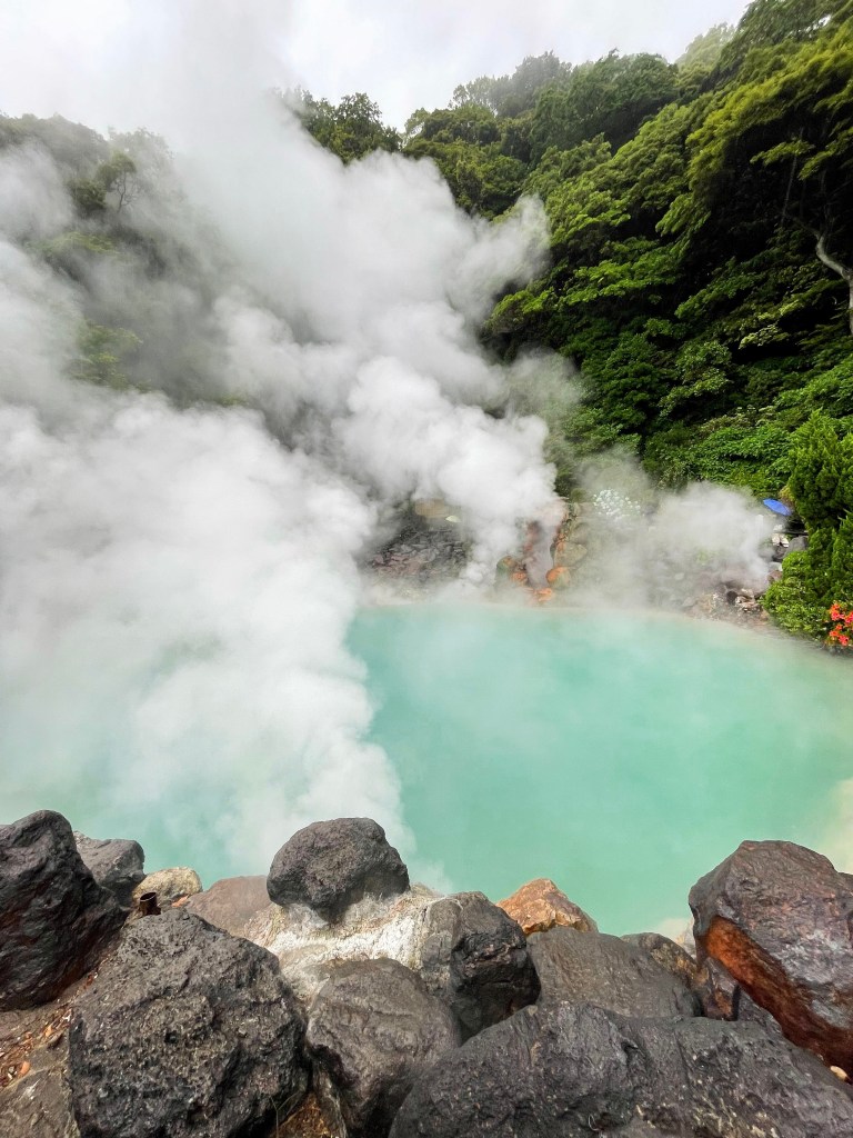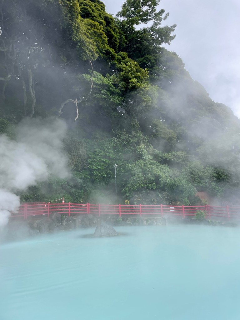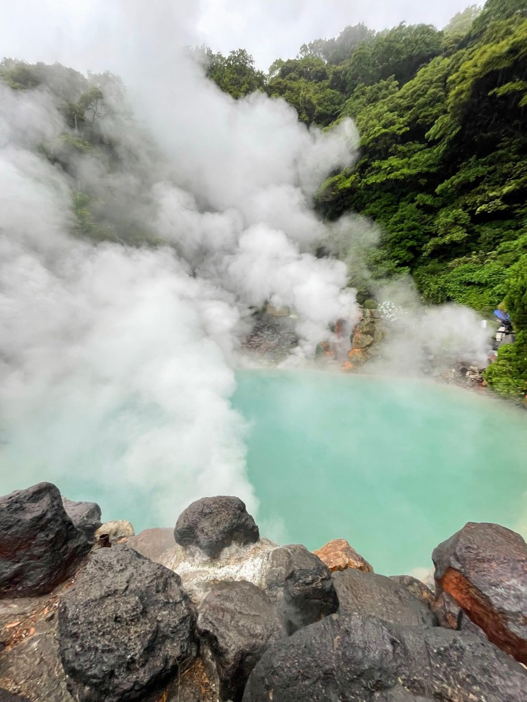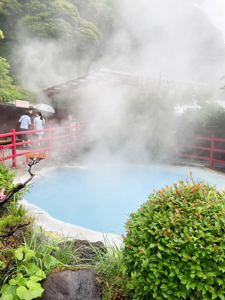 บ่อน้ำพุร้อนบ่อแรก Umi Jigoku (อุมิ จิโกกุ) บ่อนี้เป็นบ่อที่ใหญ่ที่สุดในบรรดาบ่อน้ำพุร้อนทั้งหมด น้ำในบ่อมีสีฟ้า และด้วยอุณหภูมิประมาณ 98 องศา ทำให้ควันสีขาวปกคลุมเต็มบ่อน้ำเลยค่ะ ถ่ายรูปออกมาสวยมากๆเลยนะ