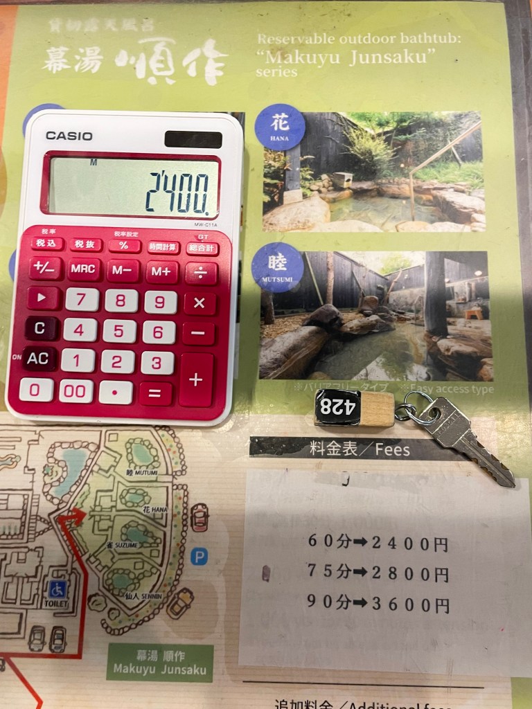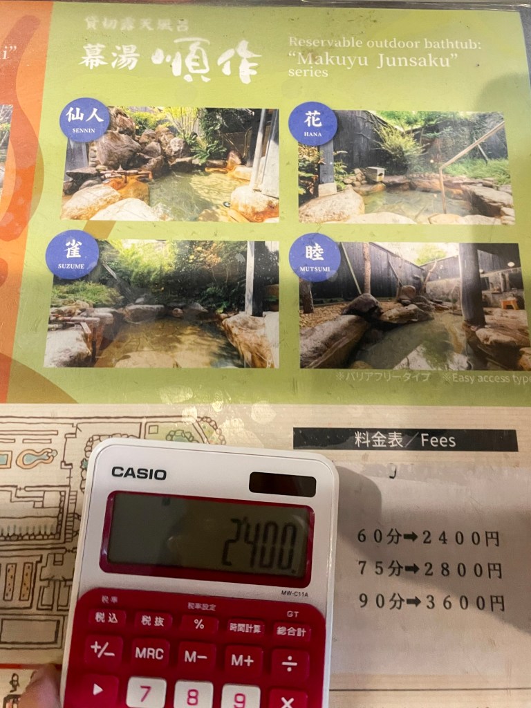 ใครจะมาใช้ออนเซ็นแบบส่วนตัวให้มาติดต่อที่เคาท์เตอร์ก่อนนะคะ เจ้าหน้าที่จะเช็คให้ว่ามีห้องไหนบ้าง แล้วเราจะแช่นานแค่ไหน ก็สามารถแจ้งและจ่ายเงินที่หน้าเคาท์เตอร์ได้เลยค่ะ