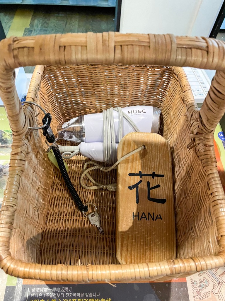 วันนี้เราเลือกแช่แบบ 60 นาที เลือกห้องเอาท์ดอร์ที่ชื่อว่า Hana จ่ายเงินเรียบร้อย เราจะได้รับกระตร้ามา ภายในตระกร้าจะมีป้ายชื่อห้องที่เราจะต้องเอาไปแขวนไว้หน้าประตู กุญแจห้อง ไดร์เป่าผม เหรียญสำหรับเอาไว้หยอดให้น้ำไหล แต่จะไม่มีผ้าขนหนูให้นะ เราต้องเตรียมมาเอง หรือสามารถซื้อเพิ่มได้