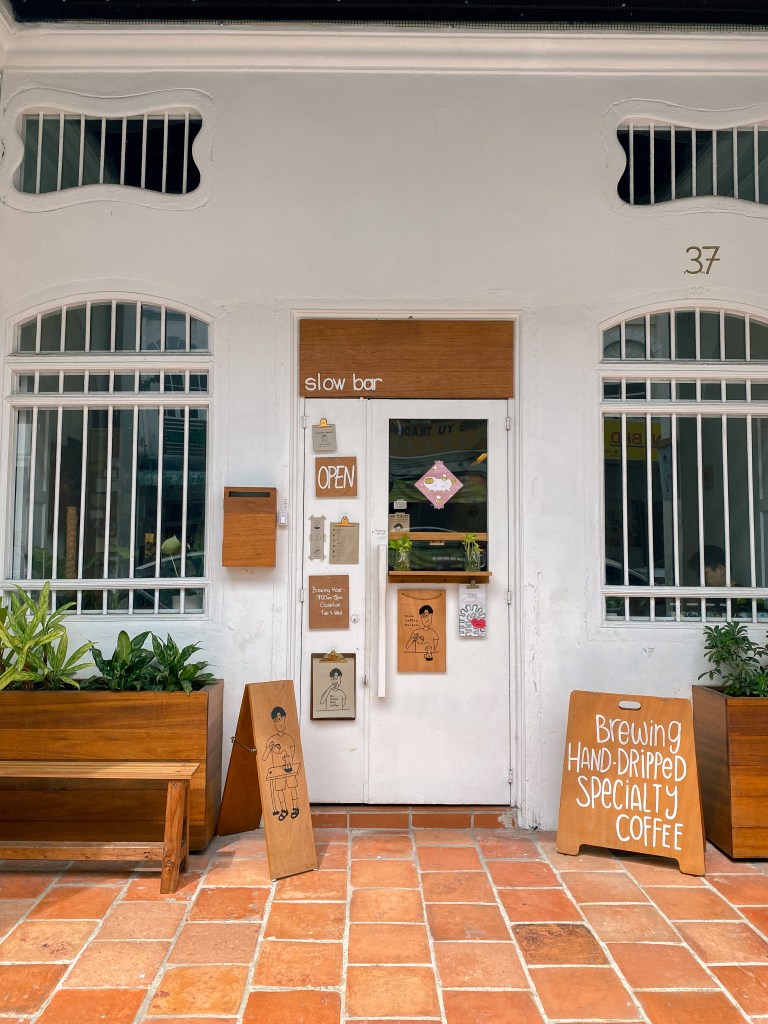 ก่อนเริ่มเที่ยวปีนัง เราขอเริ่มที่คาเฟ่เก๋ๆ กาแฟหอมๆก่อนเลย ร้านแรกที่เราอยากแนะนำก็คือ Slow Coffee Person Coffee Bar คาเฟ่ขนาดเล็กมากๆ มีโต๊ะประมาณ 3 ตัว จุลูกค้าถ้ามาพร้อมๆกันไม่น่าจะเกิน 6 คน ความพิเศษของที่นี่เริ่มตั้งแต่ตอนที่เราจะเข้าไปในร้านแล้ว เพราะเราต้องกดกริ่งให้เจ้าของร้านมาเปิดประตูให้ เมนูกาแฟที่นี่ดีมากกก ภายในร้านก็น่ารัก และที่สำคัญร้านนี้รับเฉพาะเงินสดเท่านั้นนะคะ