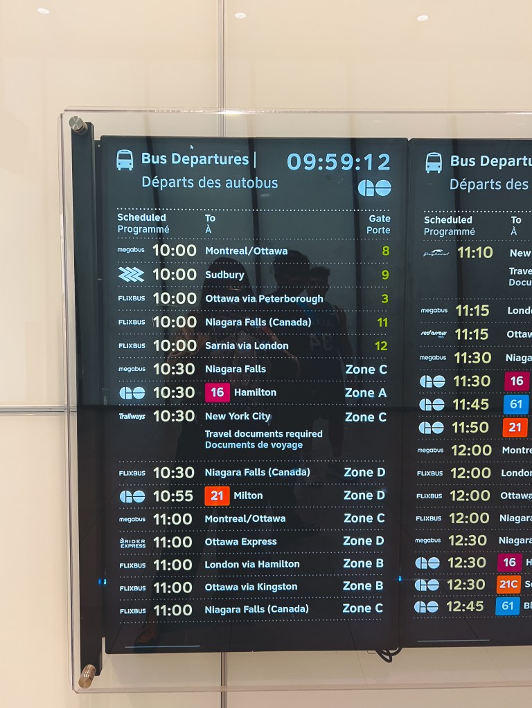 โดยเราจะไปขึ้นรถที่สถานีบัส Union Station ด้วย Union Station เป็นสถานีใหญ่ที่เป็นชุมทางในการเดินทางจาก Toronto ไปยังเมืองต่างๆ ทำให้อาจจะงงหน่อย เราแนะนำให้เผื่อเวลาด้วย